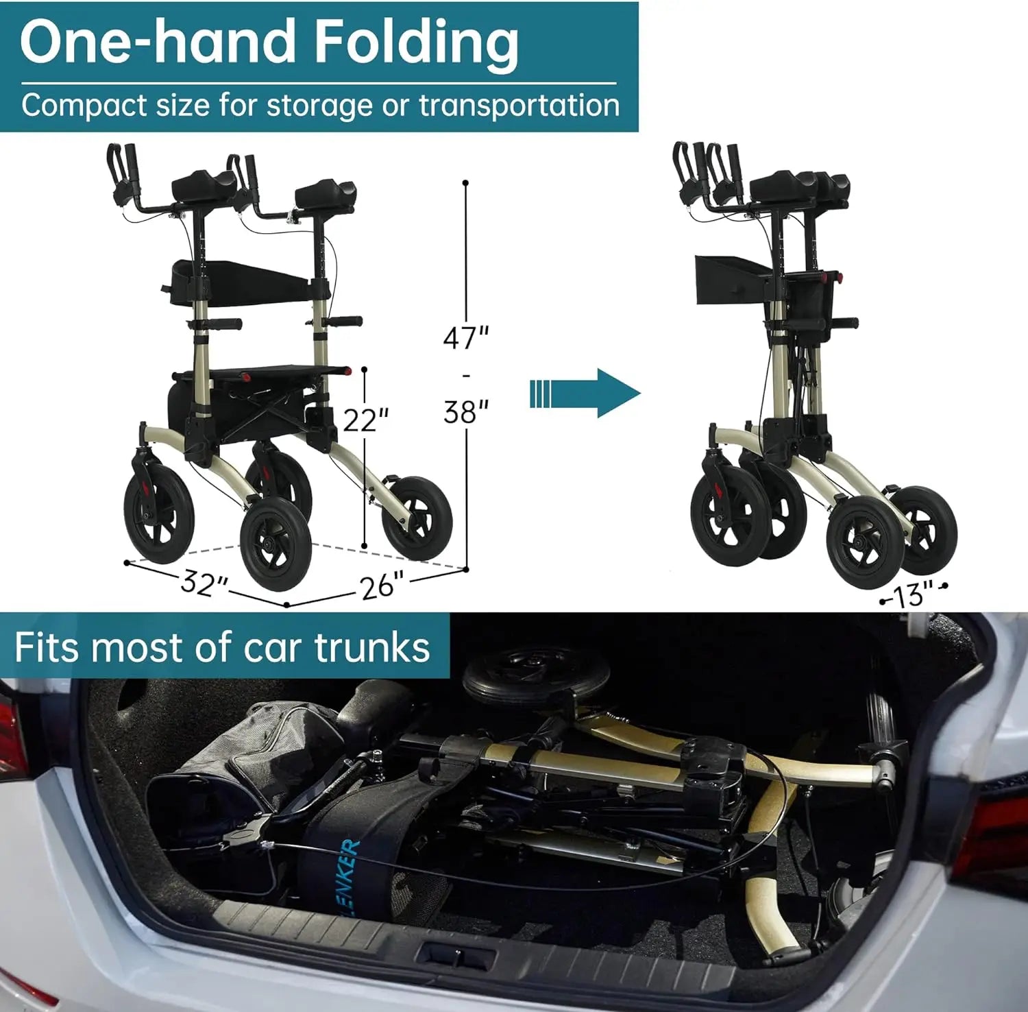 ELENKER All-Terrain Upright Rollator Walker, Stand up Rolling Walker with Seat, 12” Non-Pneumatic Tire Wheels, Compact Folding